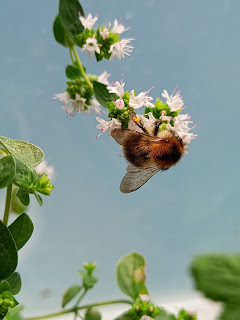 I går tog jeg disse billeder og video af en brumbasse ved oraganoen på min åbne altan.